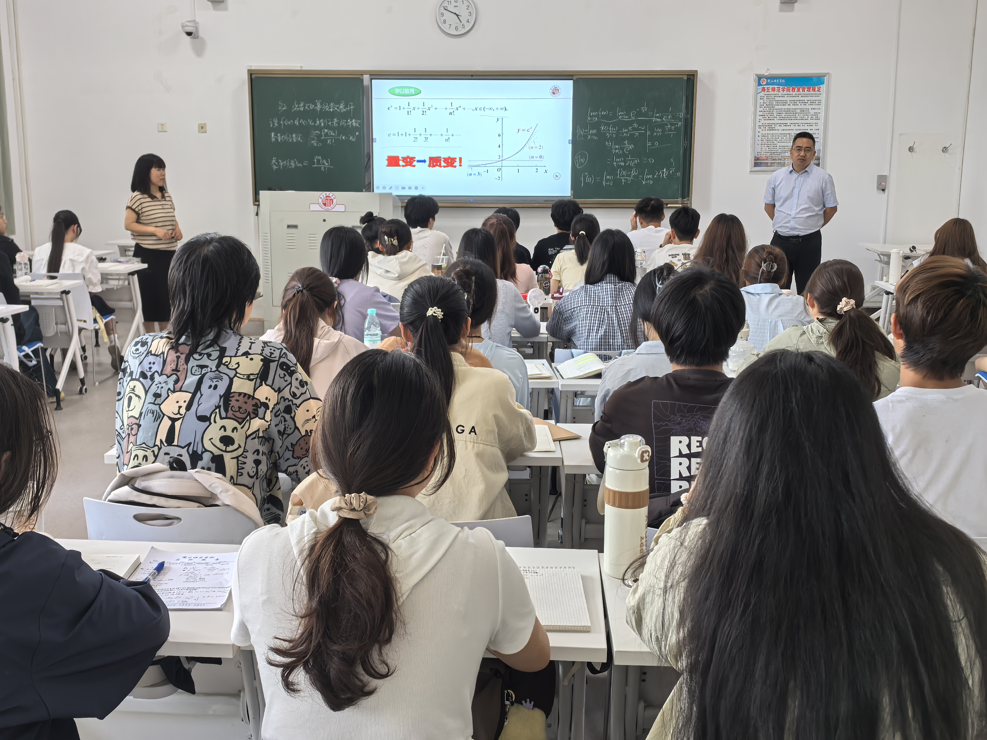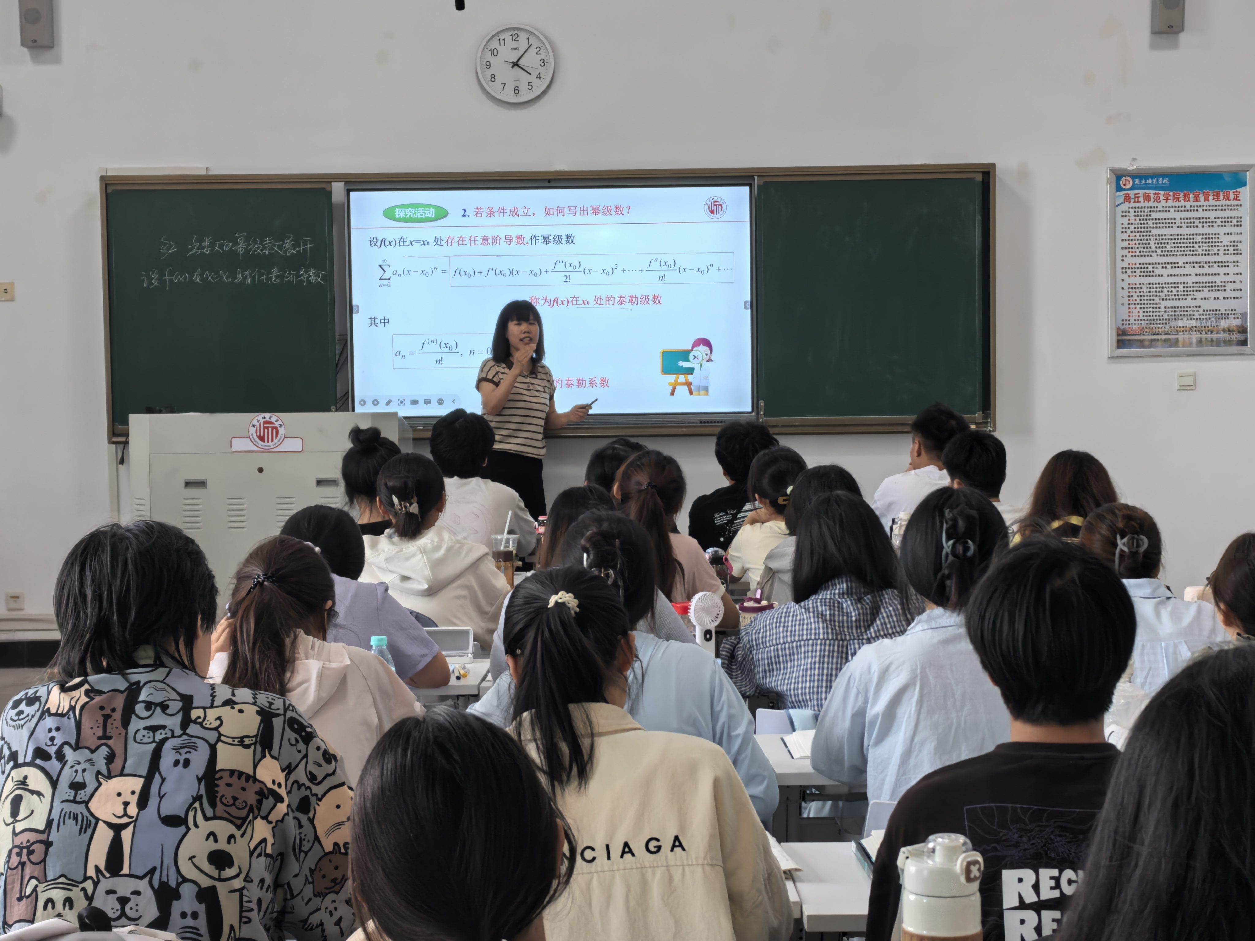 本次公开课以“函数的幂级数展开”为主题,深入讲解了泰勒级数、麦克劳林级数的理论与应用。张海燕通过问题引入、探究活动和例题解析相结合的方式,引导学生思考函数展开为幂级数的条件、方法及其收敛性。课堂上,张海燕不仅注重理论推导,还结合应用,如非初等函数的幂级数表示、近似计算,展示了数学分析在实际中的广泛应用。她的讲解逻辑清晰,层层递进,充分体现了“以学生为中心”的教学理念。课程中,张海燕特别强调了学生自主探究能力的培养。通过分组讨论和互动问答,学生们积极参与。课堂最后,张海燕布置了具有挑战性的作业任务,进一步巩固了学生的学习成果。